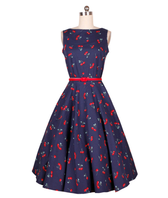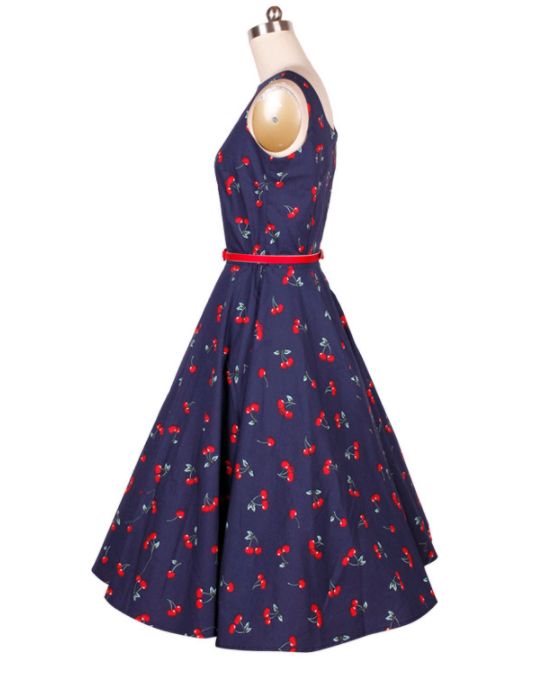 <무배> 네이비 민소매 체리 원피스 벨트 귀여운 플레어 A라인 : 라라리빠